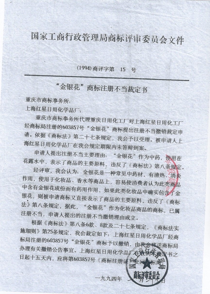 申请人诗妍公司向法庭展示了(1994)商评字第15号“金银花”商标注册不当裁定书。这份裁定书载明,重庆日用化工厂对上海红星日用化工厂(金银花商标的注册人)提出了商标注册不当撤销申请,当时的国家工商行政管理局商标评审委员会作出裁定:对该商标予以撤销。