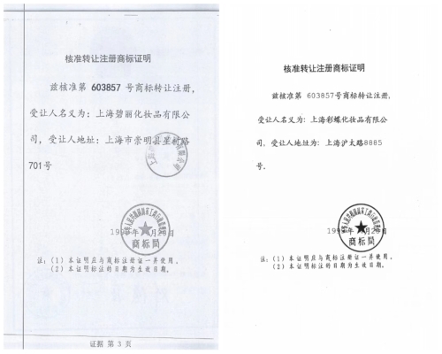 然而,诗妍公司向国家知识产权局调取原始档案发现,在碧丽公司受让该商标之前,该商标是由上海彩蝶化妆品有限公司受让取得,两家公司地址不一样。但受让时间又是一致的。“显然,碧丽公司提供给法院的证据为假。申请人存在向法院提交虚假变造证据的不诚信行为。”赵智庆说。