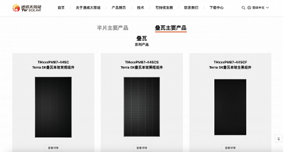 界面新闻注意到,通威太阳能官网显示了七款叠瓦主要产品。在去年年报中,通威股份在组件部分提到,海外市场重点聚焦欧洲、亚太、南美等终端市场,利用各版型叠瓦、半片产品“矩阵”,满足海外客户对高效组件的差异化需求。